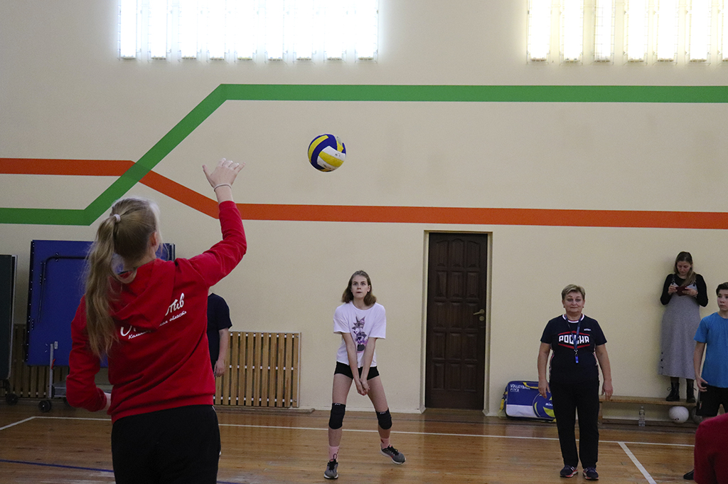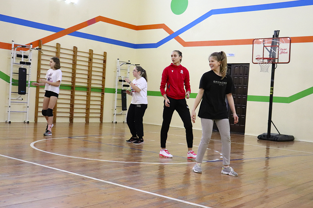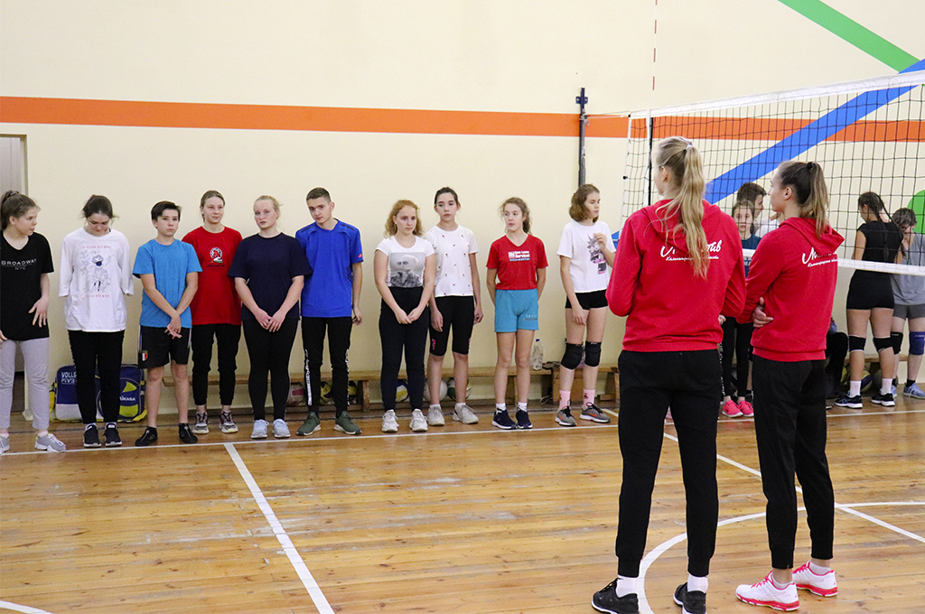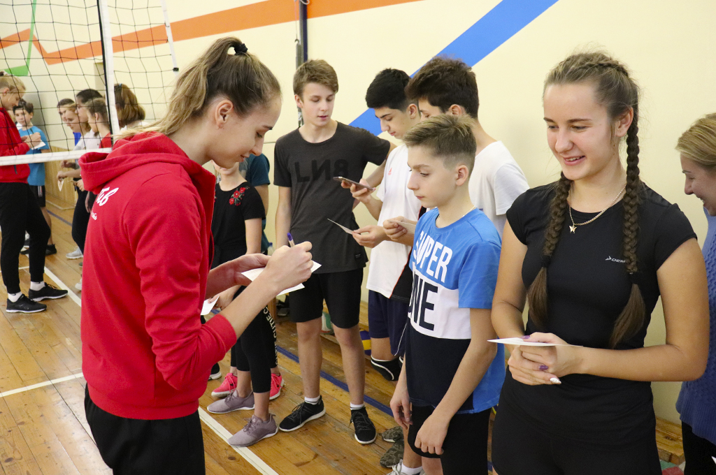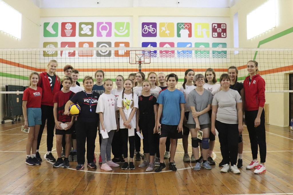 Разминка, упражнения на технику и тактику от игроков "Локо". Мальчишки и девчонки вглядываются в каждое движение профессиональных игроков, стараясь уловить все нюансы. Хорошенько подготовив мышцы, можно выходить на площадку. Валерия и Анастасия обозначили важность командного духа при игре в волейбол и сыграли вместе с учащимися Центра.