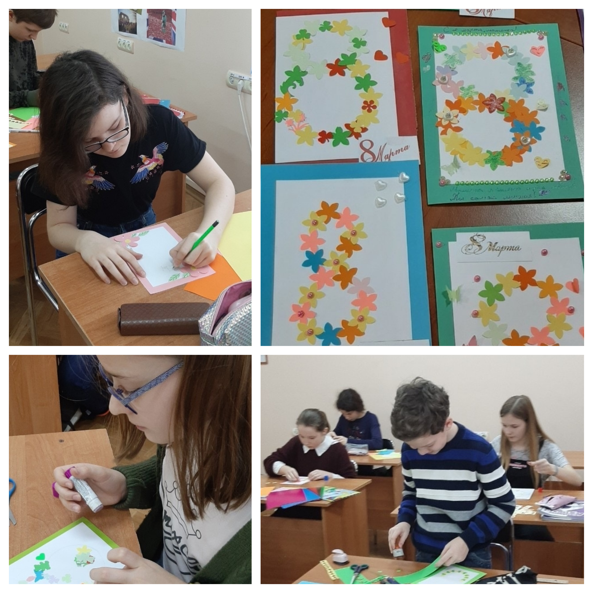 3 марта в группе английского языка 4П-5, совместно с педагогом Онориной О.А. было проведено интегрированное занятие, посвященное «8 Марта». В начале занятия ребята представляли презентации о «Международном женском дне» - рассказывали об истории возникновения этого праздника. Затем ученикам было предложено сделать поздравительную открытку с использованием современной техники скрапбу́кинг, скрэпбу́кинг (англ. scrapbooking ← scrapbook от scrap «вырезка» + book «книга», букв. «книга из вырезок»), которая широко используется в изготовлении и оформлении семейных или личных фотоальбомов. Учащимся были предложены цветной картон, бумага, фигурные дыроколы, клей и ножницы. В качестве поздравлений ученики выбирали любое понравившееся из представленных трех. Все ребята приняли активное участие в данном занятии, открытки получились красочными, каждый смог проявить свою фантазию и раскрыть творческий потенциал в полном объёме.